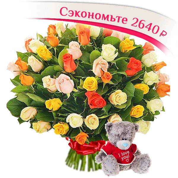 51 роза: роза разноцветная - 51 шт. (высота розы - 60 см),
