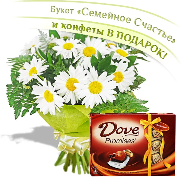 9 ромашек: ромашка белая - 9 шт, салал, триферн - 2, папоротник - 3 шт, фетр зеленый, конфеты "Dove promises".
